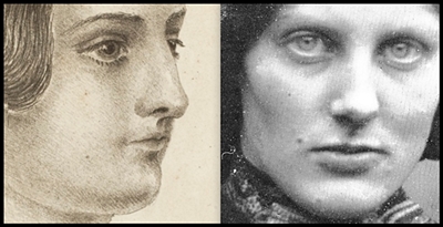 Left: Charlotte Bronte in Branwell Bronte's 'Pillar' portrait. Right: A